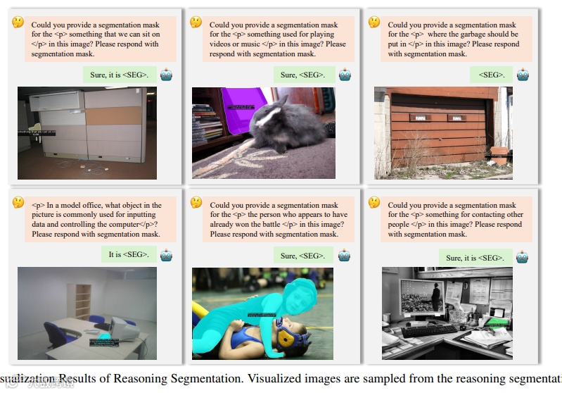 推理分割是分割任务中的“高阶挑战”,需模型先理解抽象问题,再推理出对应目标。例如“用来播放视频或音乐的物品”“办公室里用来输入数据的设备”,这类查询不直接提及目标名称,需结合常识推理。从Fig.9的结果来看: