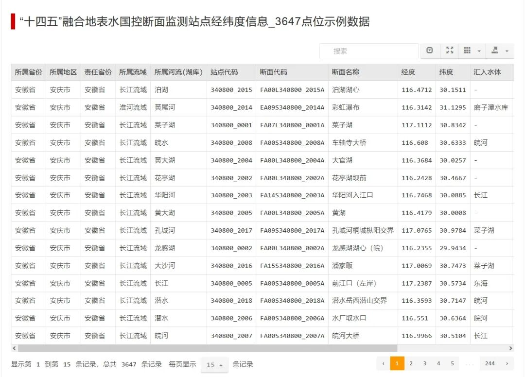 “十四五”地表水水质国控断面站点信息坐标位置经纬度数据,该数据集由生态环境部发布,非常准确,共3647点位,含所属省份,所属地区,责任省份,所属流域,所属河流(湖库),站点代码,断面代码,断面名称,经度,纬度,汇入水体,断面类型,断面属性等信息
