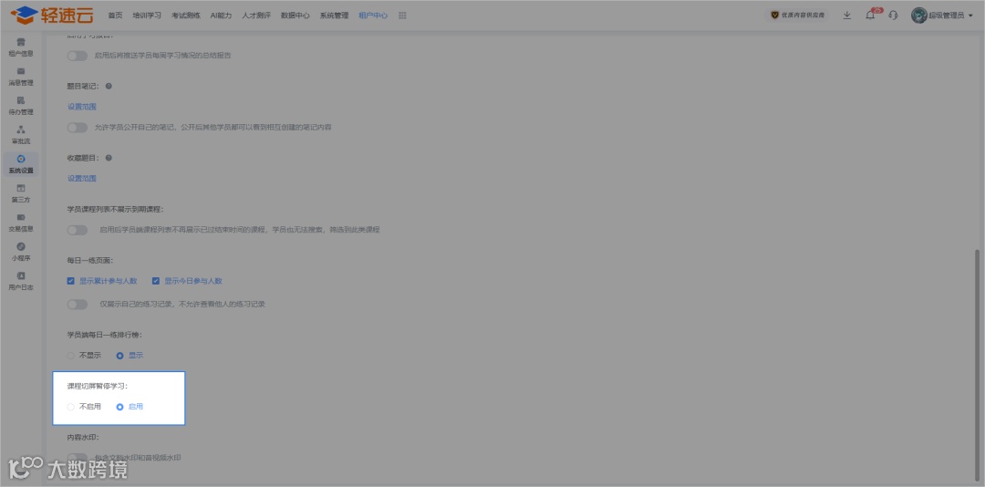在「数据权限」页面中,可以启用人才测评功能相关菜单的数据权限。启用后,能够限制子管理员是否可见他人创建的数据或是否能操作编辑他人创建的数据。