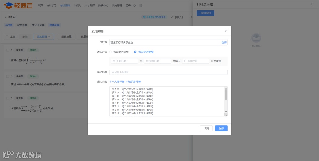 在钉钉中打开管理端时,考试设置的排行榜相关设置中可以找到「排行榜推送到钉钉群」功能。启用后,机器人会在指定的触发时机在预设的钉钉聊天群里推送当前的排行榜排名信息。