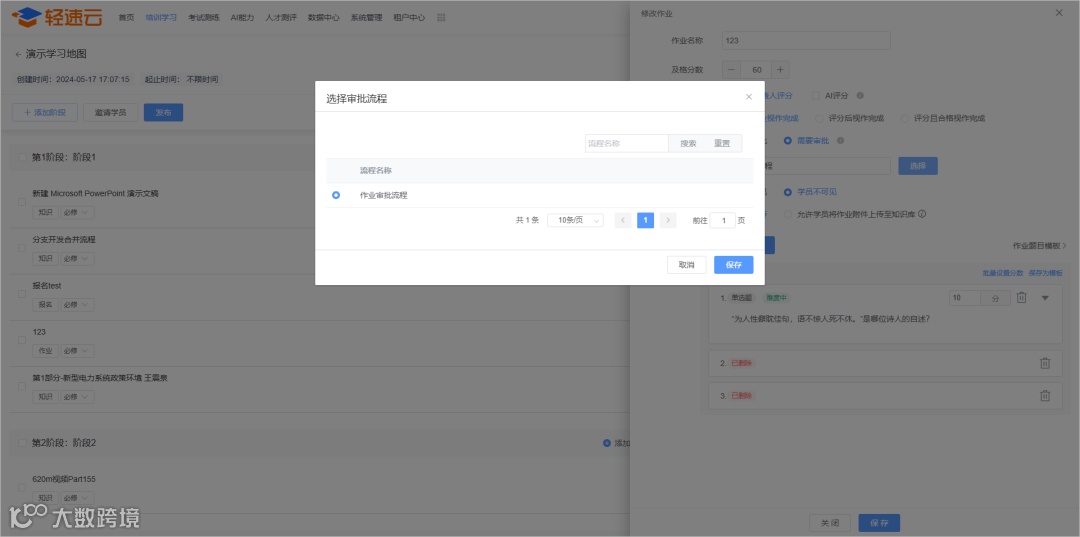 学习地图与新员工培训中添加的作业任务,增加审批流程与对应的消息提醒功能。