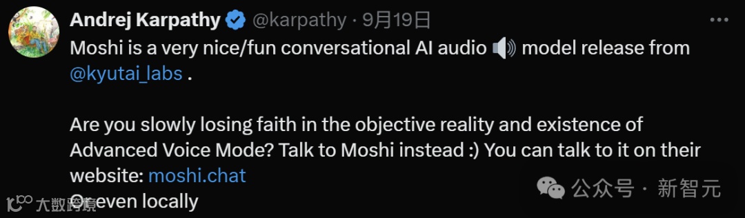 两个多月前那个对标GPT-4o的端到端语音模型,终于开源了。大神Karpathy体验之后表示:nice!