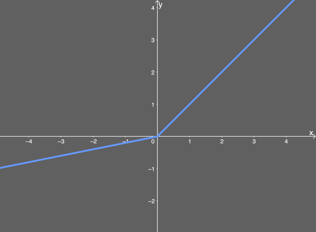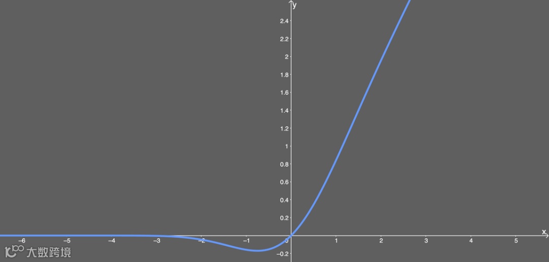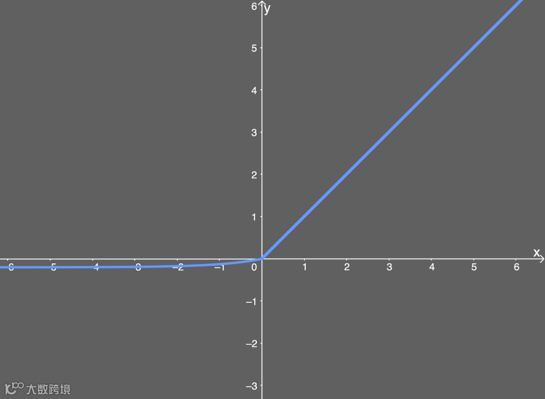 我解释一下。如果你输入的 x 值大于 0,则结果与 ReLU 一样——即 y 值等于 x 值;但如果输入的 x 值小于 0,则我们会得到一个稍微小于 0 的值。