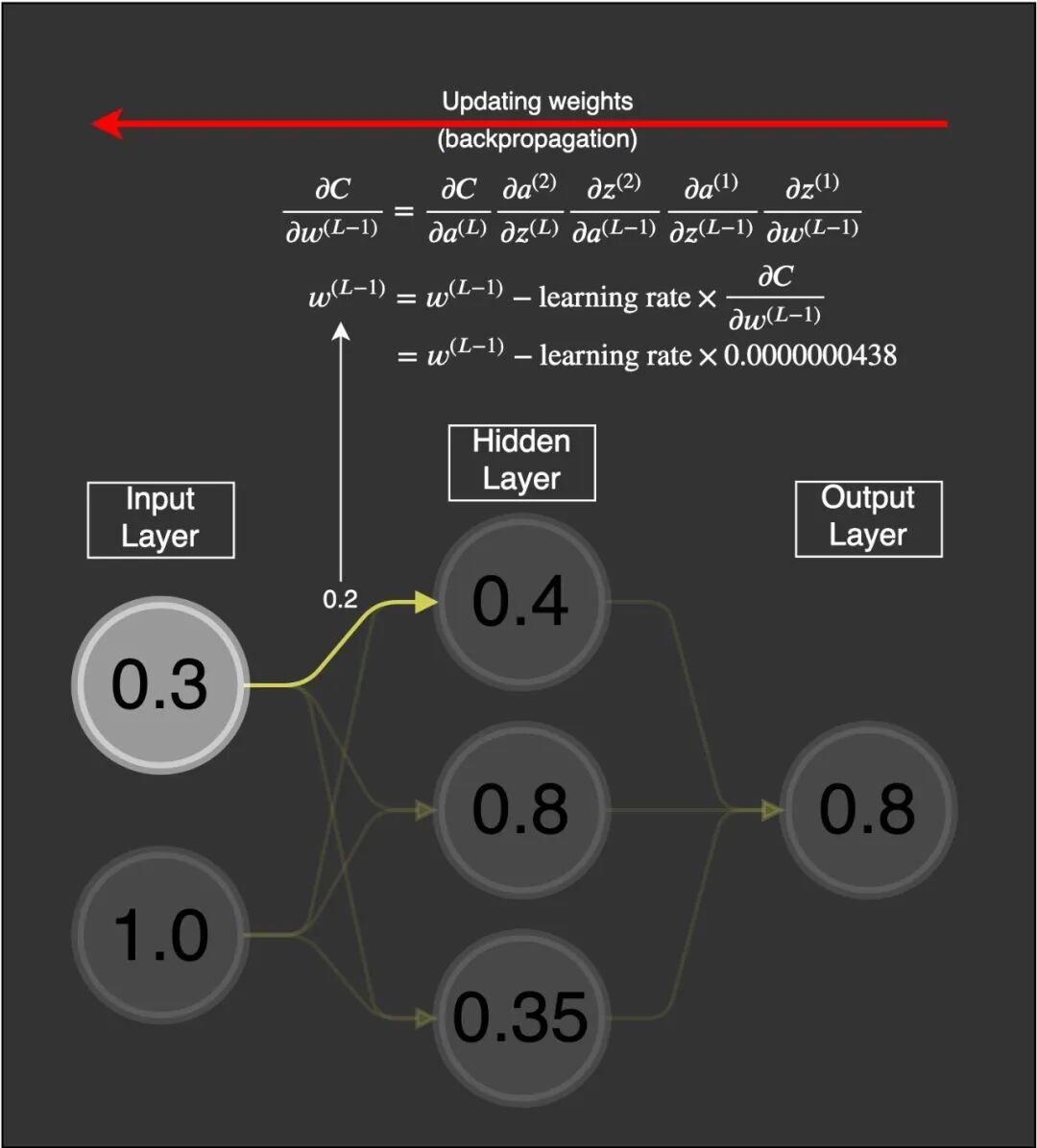 假设这个权重的值为 0.2,给定一个学习率(具体多少不重要,这里使用了 0.5),则新的权重为: