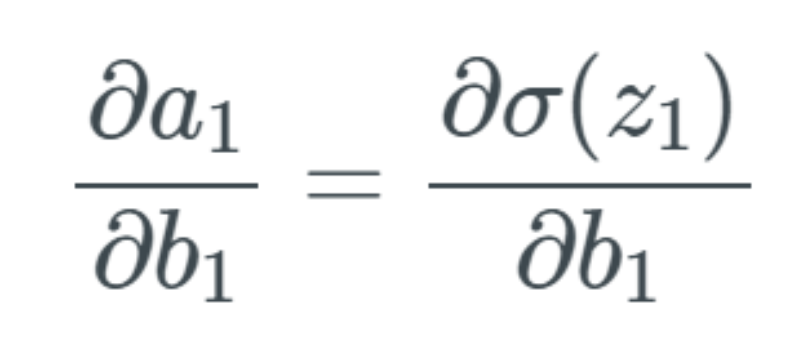 因此,我们左边有偏导的表达式,这是 b_1 中与 a_1 相关的变化。但我们开始替换左边的项,先用 z_1 的 sigmoid 替换 a_1: