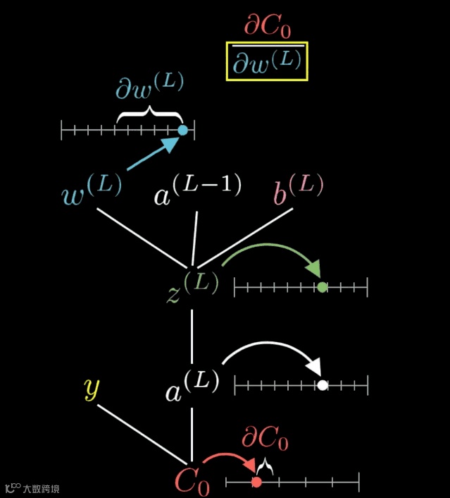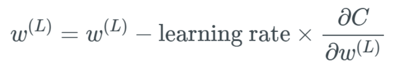 在反向传播过程中,我们必须计算每个权重影响成本函数(cost function)的比例,具体做法是计算成本函数相对于每个权重的偏导数。假设我们不定义单个的权重,而是将最后一层 L 中的所有权重 w 定义为 w^L,则它们的导数为: