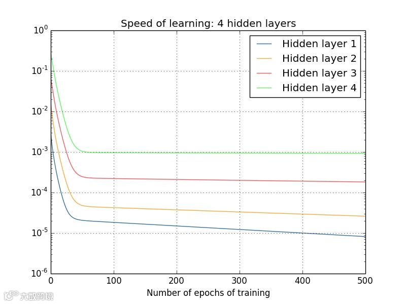 在这个示例中,隐藏层 4 的学习速度最快,因为其成本函数仅取决于连接到隐藏层 4 的权重变化。我们看看隐藏层 1;这里的成本函数取决于连接隐藏层 1 与隐藏层 2、3、4 的权重变化。如果你看过了我前一篇文章中关于反向传播的内容,那么你可能知道网络中更前面的层会复用后面层的计算。