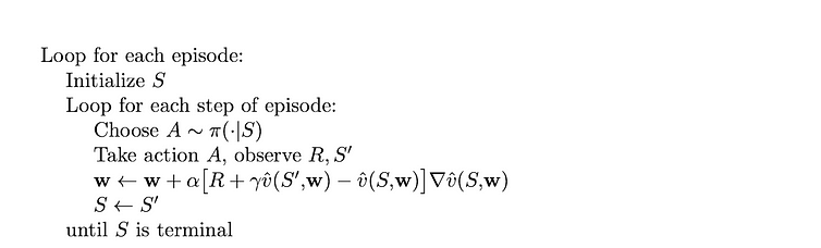 我们的目标是找到 v̂ 和 w。函数 v̂ 可以采用各种形式,但最常见的方法是使用监督学习算法。事实证明,v̂ 可以是线性回归、决策树,甚至是神经网络。同时,任何状态 s 都可以表示为描述该状态的一组特征。这些特征作为 v̂ 算法的输入。