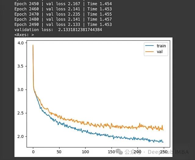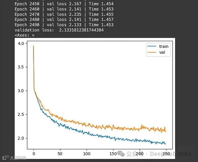 上图显示了训练和验证损失的变化。训练进行了2500个epoch。使用Google Colab的默认GPU和RAM设置,整个训练过程大约花费了10分钟,这是相当快速的。最后一个epoch的验证损失为2.19,考虑到我们使用的训练数据量和epoch数量,这个结果是可以接受的。要显著降低损失,我们还需要增加训练数据的规模、提高epoch数量,并使用更强大的GPU或处理能力。