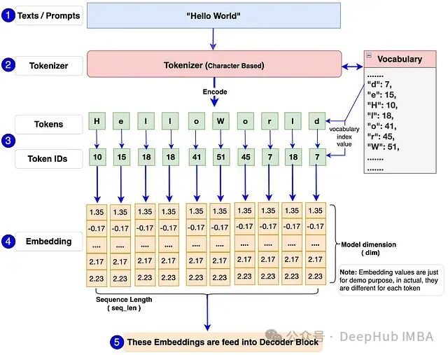 首先,单个或批量文本/提示被输入模型。例如:图中的"Hello World"。