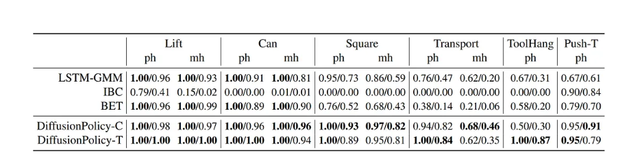 该研究采用了一种颇具启发性的策略:规划一定时间跨度的轨迹,执行其中部分动作后重新规划,如此循环直至任务完成。这种闭环动作序列生成方式能有效应对外界干扰。论文在仿真环境和真实机器人平台上进行了大量实验,结果表明扩散策略在几乎所有测试场景中都优于其他策略学习方法。