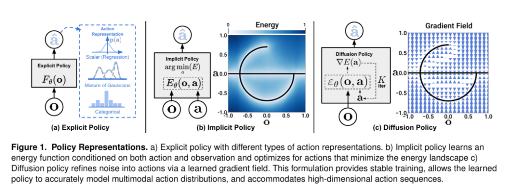 - 隐式策略:不直接定义策略函数,转而通过学习观测与动作之间的能量函数(energy function)来间接表征策略。此时,最优动作可通过最小化能量函数获得。