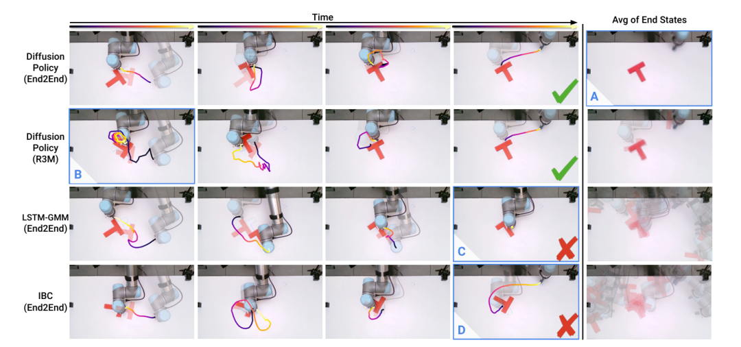 本文进一步通过现实世界实验评估扩散策略。其中一个实验是推动T形物体,此时末端执行器的运动轨迹仅涉及三维坐标。