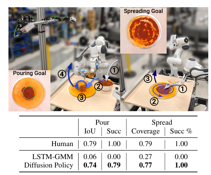 最后,本文还设计了酱料倾倒和摊开任务,在此场景中扩散策略能够稳健地处理复杂的酱料操作。
