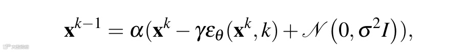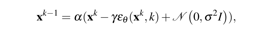 在生成步骤中,我们从一个随机的高斯噪声图像开始,不断减去由学习率缩放的网络预测的噪声。我们还在每次迭代中添加少量噪声,以进行探索以保持一定的随机性。这个过程可以这样表达: