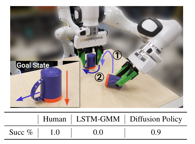 此外,扩散策略还具有突出的时序连贯性优势。由于采用整段动作序列生成机制,该策略对示范数据中存在的随机暂停干扰具有较强鲁棒性。相较而言,基于RNN的策略采用逐步生成方式,容易出现策略模式跳变问题(即相邻动作可能来自不同策略模式)。更值得注意的是,这种逐帧采样机制容易对示范轨迹中的暂停动作产生过拟合,导致策略在实际执行中出现非预期的停顿现象。扩散策略的批量生成特性则有效规避了这一问题,确保了动作序列在时间维度上的连贯性和稳定性。