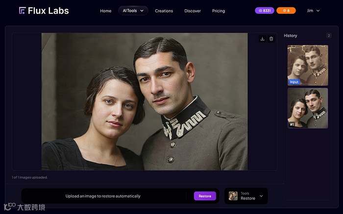 然后点击“Restore”按钮,等待输出的图片。修复后的图片会显示在屏幕中央。你可以通过点击历史面板中的缩略图,将其与原始图片进行对比。
