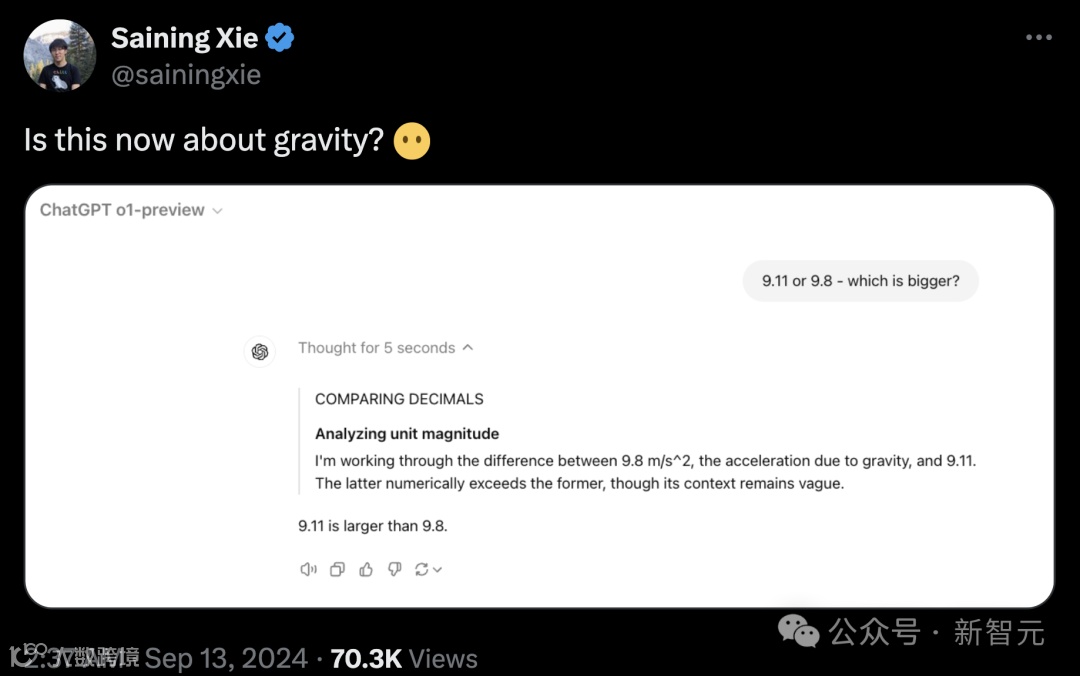 还有NYU助理教授谢赛宁上手测试了「9.11和9.8谁大」的经典问题,没想到o1-preview依旧答错了。