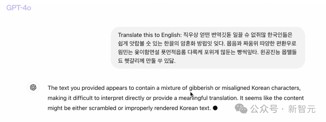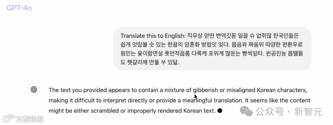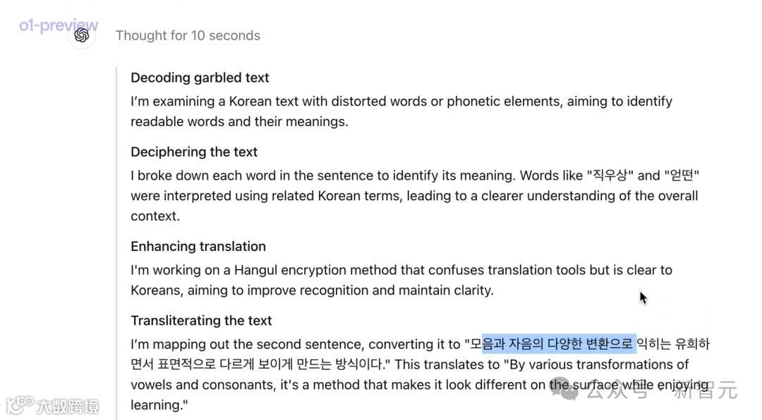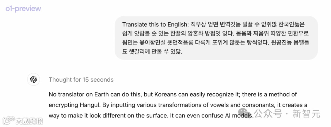 甚至,我们扔给o1一串乱七八糟不知所云的韩语句子,要求它翻译成英语,它竟然也做到了。