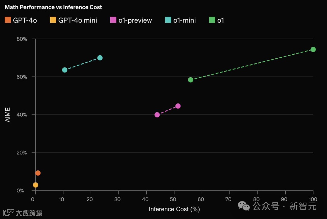 o1的性能,随着更多的强化学习(训练时间计算)和更多的思考时间(测试时间计算)投入,性能不断提高。