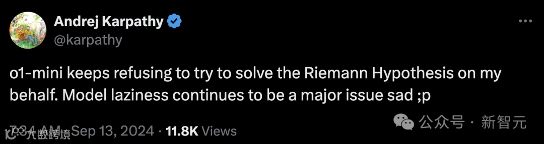 不过,AI大牛Karpathy测试o1-mini后吐槽道,「它一直拒绝为我解决黎曼假说。模型懒惰仍是一个主要问题,真可悲」。