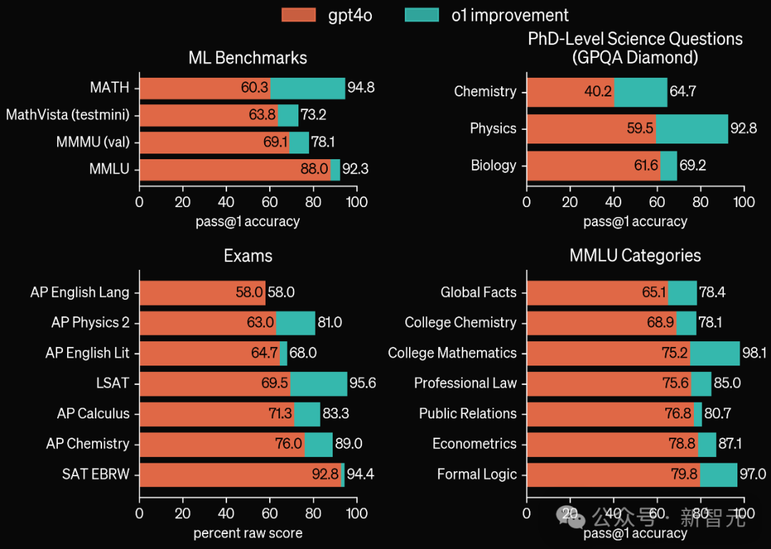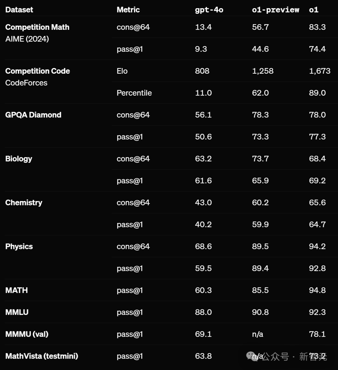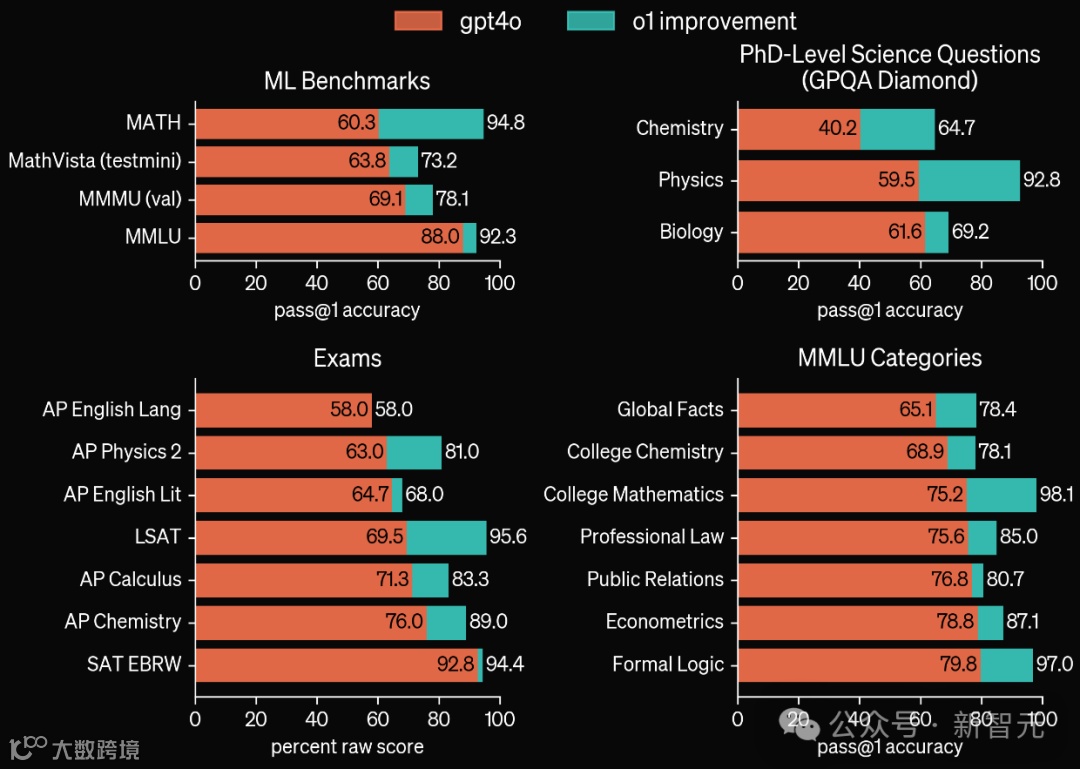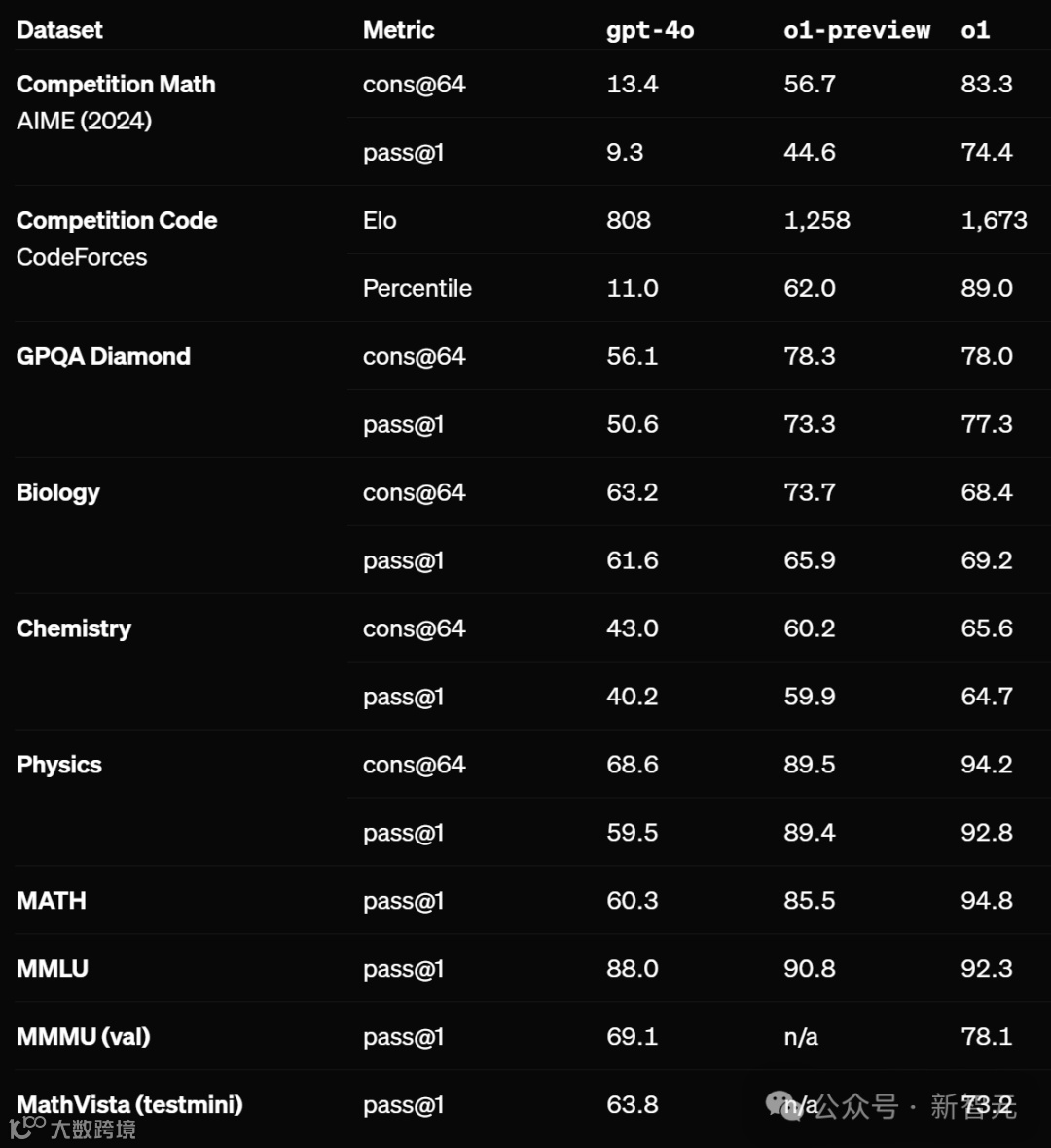 在一系列基准测试中,o1相比GPT-4o再次有了巨大提升,具有了奥数金牌能力,在物理、生物、化学问题的基准测试中,直接超过了人类博士水平!