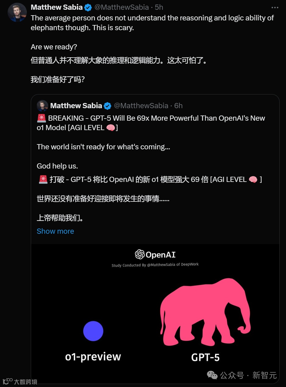 大V Mattew Sabia表示,最可怕的是,GPT-5还要比o1模型更强大69倍。而普通人,根本不理解大象的推理和逻辑能力。