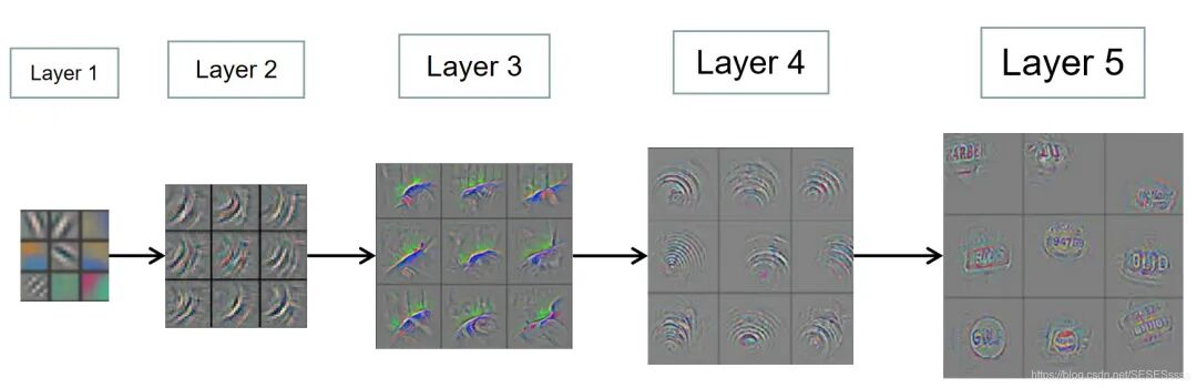 对于CNN网络,图像通过网络浅层的卷积层,输出的特征图往往只能表示一些简单的语义信息(比如一些简单的线条),越深层的网络,提取特征表示的语义信息也就越复杂(从一些纹理,到一些类别具有的相似轮廓):(图中的特征有经过反卷积上采样)