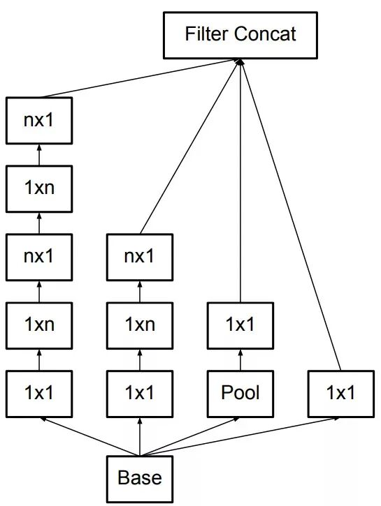 进一步的,Inception v2将nxn卷积分解为两个1xn和nx1卷积(空间可分离卷积Spatially Separable Convolution),在感受野相当的情况下,进一步减少了网络的参数: