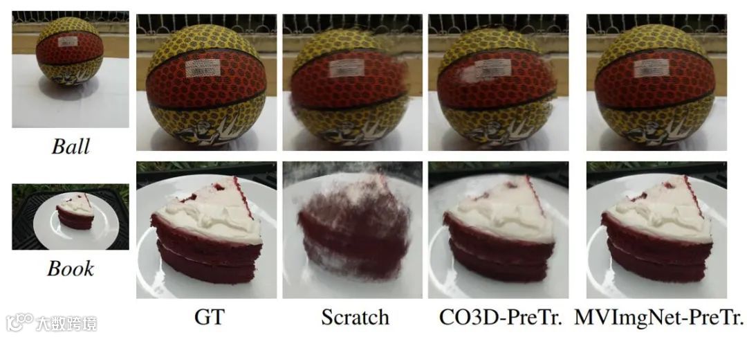 研究团队探索了 MVImgNet 对 NeRF 重建以及 MVS 的帮助:通过在 MVImgNet 上训练 NeRF,提升了 generalized NeRF 的泛化能力;通过在 MVImgNet 上预训练自监督 MVS 方法,并将预训练模型迁移到 DTU 数据集上,获得了不错迁移性能。下表展示了直接在 DTU 数据集上训练的模型与用 MVImgNet 预训练模型微调的量化对比结果: