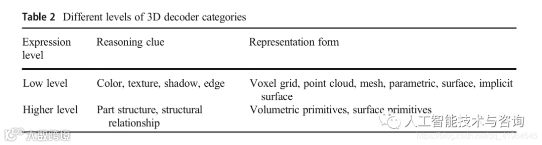 基于神经网络的2D编码器从大量数据中学习将输入图像编码为潜在向量。然后一个3D解码器将潜在向量转换成三维数据。为了从输入图像中生成三维形状,整个网络需要将低级图像特征与高级特征相结合。基于单幅图像的三维物体重建方法大多选择使用低层图像特征进行推理。但是,这些方法缺乏对对象结构或表达式级别的结构关系的理解。它们有几种输出表示:体素网格、点云、网格、参数曲面和隐式曲面。此外,一些作品试图理解对象结构的高级表示,他们将3D对象视为两个基元(体积基元或表面基元)的集合。进一步的研究试图在更高的层次上理解各部分之间的对称关系[76]。三维解码器分类如表2所示。