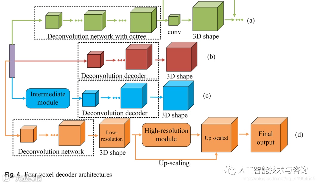 其他的解码 除了使用中间表示法和八叉树法生成高分辨率三维对象外,还有将三维形状的生成视为二维预测的方法[88,103,98]。Richter等[88]在考虑二维预测而不是三维物体重建后,提出了一种三维几何的二维编码方法。为了更有效地表达低分辨率的3D形状,他们开发了一种方法,从参考视图的每个像素预测整个体素管。此外,6个嵌套深度图的融合用于扩展生成的3D对象分辨率。Smith等人[103]f i r st通过低分辨率的3D编解码器重建了一个粗略的3D形状。然后,利用三维超分辨率网络对六幅高分辨率正交深度图进行恢复。最后,利用高分辨率深度图对上采样的粗糙三维形状进行切割,完成高分辨率三维形状(图4d)。此外,Shen等[98]提出了一种基于傅里叶变换的三维重建方法,在频域预测切片,从二维空间重构三维形状。