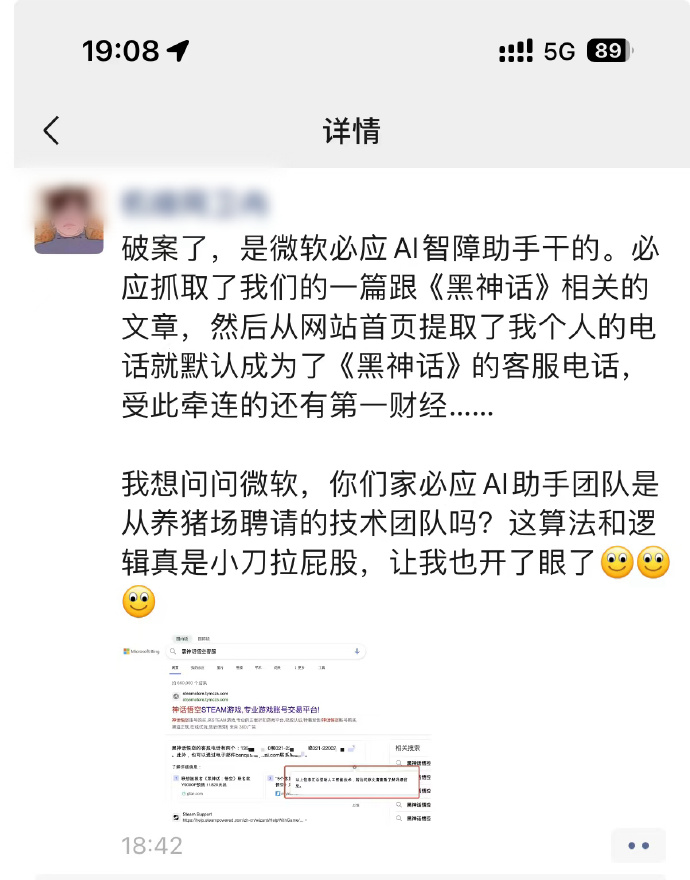 被泄露电话的当事人表示,他在 5 小时里,接了差不多小 20 个电话。据悉,这一事件发生的主要原因是微软必应 AI 助手错误抓取信息导致其个人信息泄露,之后尽管被抓取的相关文章已删除,受害人已提交申诉等反馈,但错误的“黑神话悟空客服”信息仍一度出现在必应搜索首页。目前,从搜索情况来看,必应团队已对错误信息进行更正。