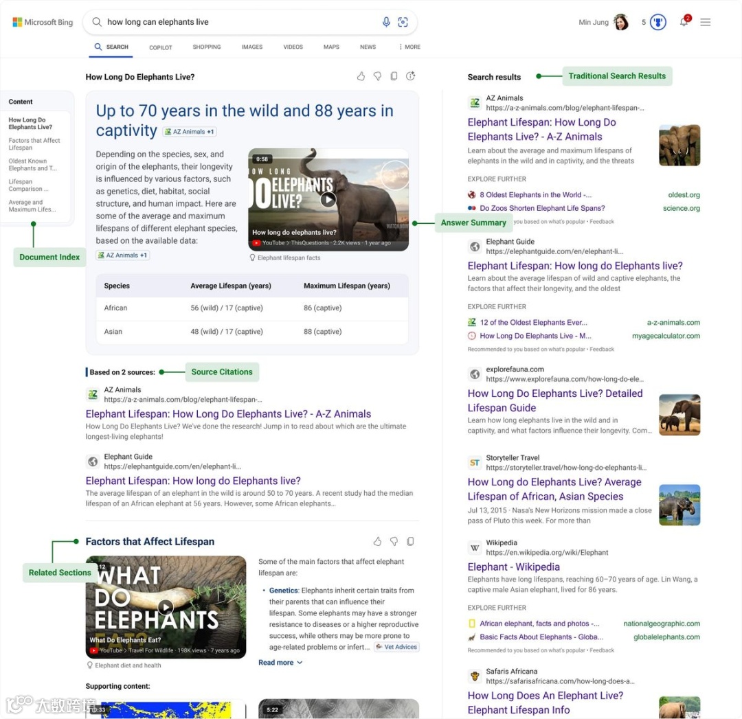 例如当查询“大象能活多久”时,回答发的摘要主体后面还列出了影响大象寿命因素的视频;如果用户搜索“什么是意式西部片?”,必应生成式搜索就会显示关于这一电影子类型的历史、起源以及经典作品信息,同时给出指向这些信息的链接与信源。