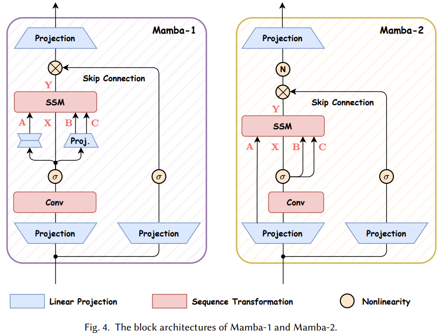 下面来看看 Mamba-1 和 Mamba-2 的块设计。图 4 比较了这两种架构。
