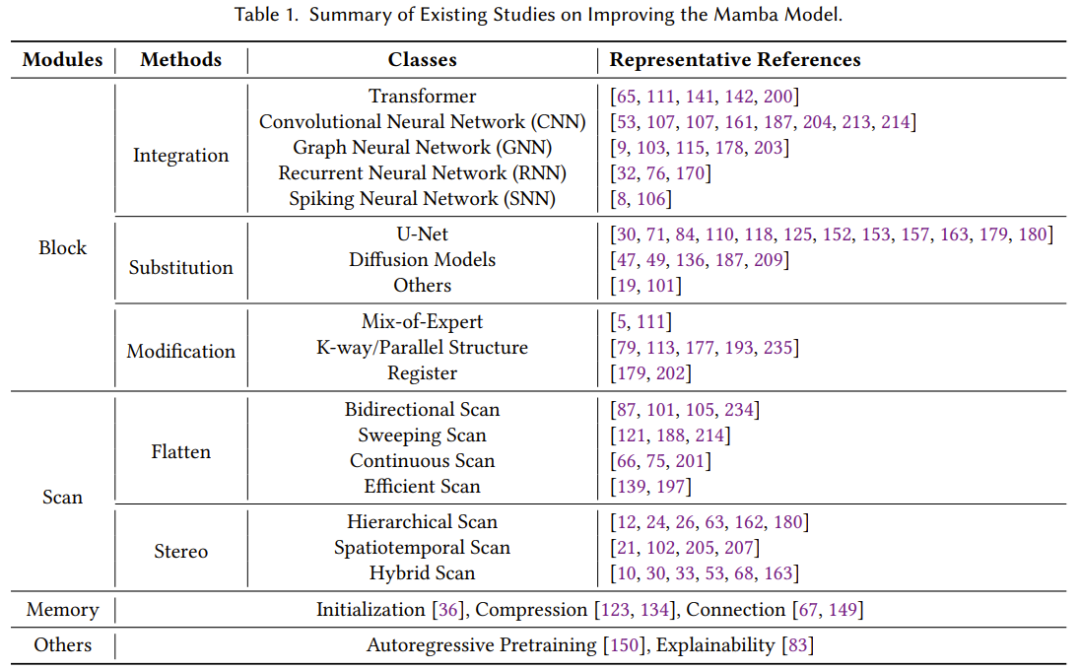 状态空间模型和 Mamba 近来发展迅猛,已经成为了一大极具潜力的基础模型骨干网络选择。尽管 Mamba 在自然语言处理任务上表现不俗,但也仍具有一些难题,比如记忆丢失、难以泛化到不同任务、在复杂模式方面的表现不及基于 Transformer 的语言模型。为了解决这些难题,研究社区为 Mamba 架构提出了诸多改进方案。现有的研究主要集中于修改块设计、扫描模式和记忆管理。表 1 分类总结了相关研究。