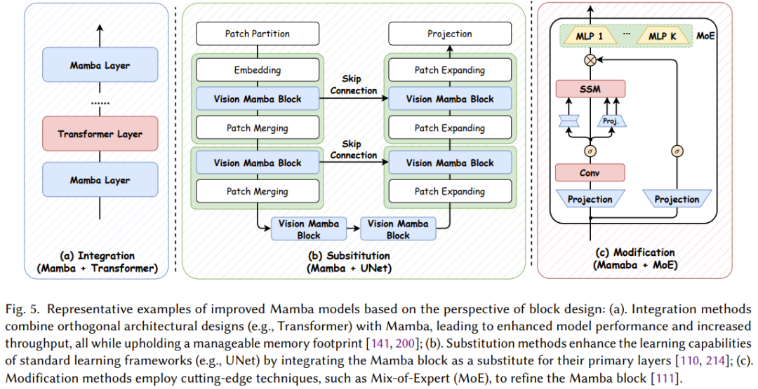 如图 5 所示,基于构建新 Mamba 模块的不同方法,现有研究可以分为三类: