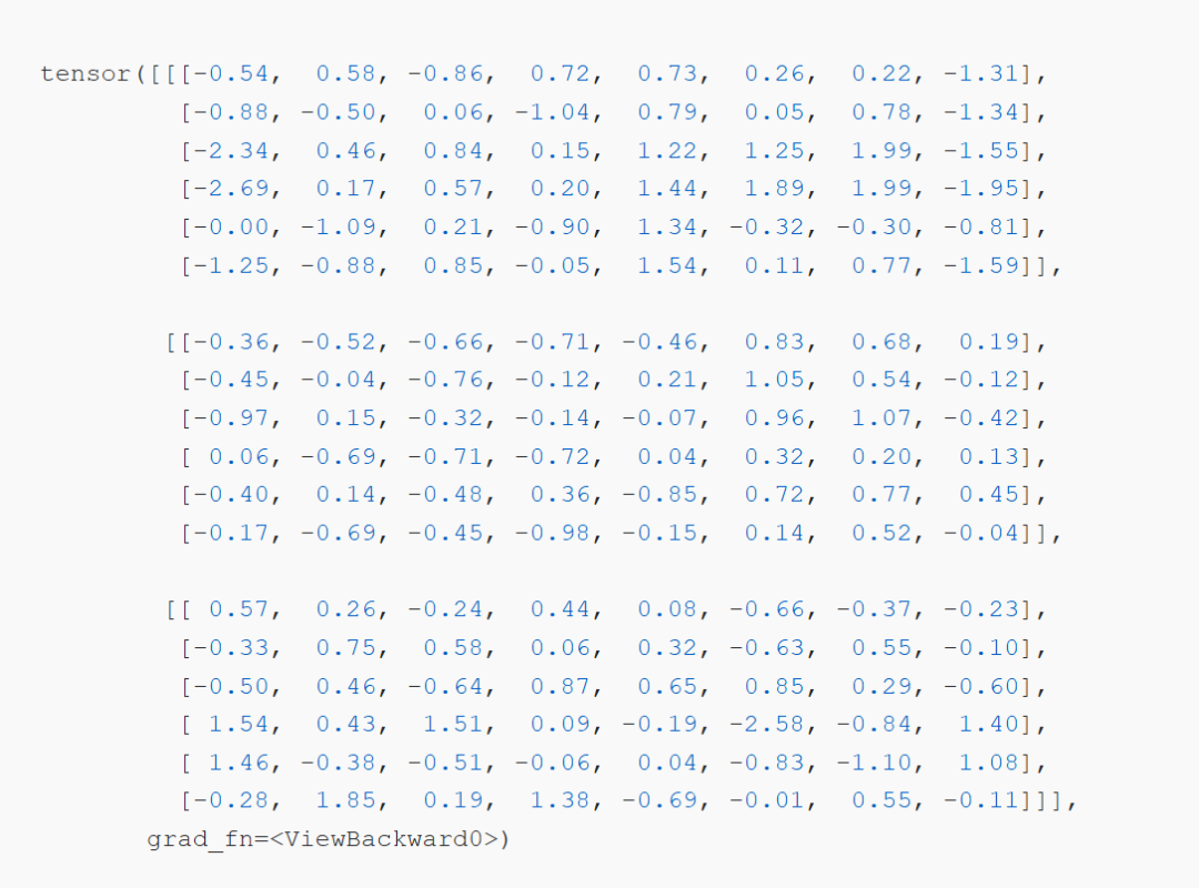 # query tensor | (3, 6, 4, 2) -> (3, 4, 6, 2)Q = Q.permute(0, 2, 1, 3)# key tensor | (3, 6, 4, 2) -> (3, 4, 6, 2)K = K.permute(0, 2, 1, 3)# value tensor | (3, 6, 4, 2) -> (3, 4, 6, 2)V = V.permute(0, 2, 1, 3)print(Q)