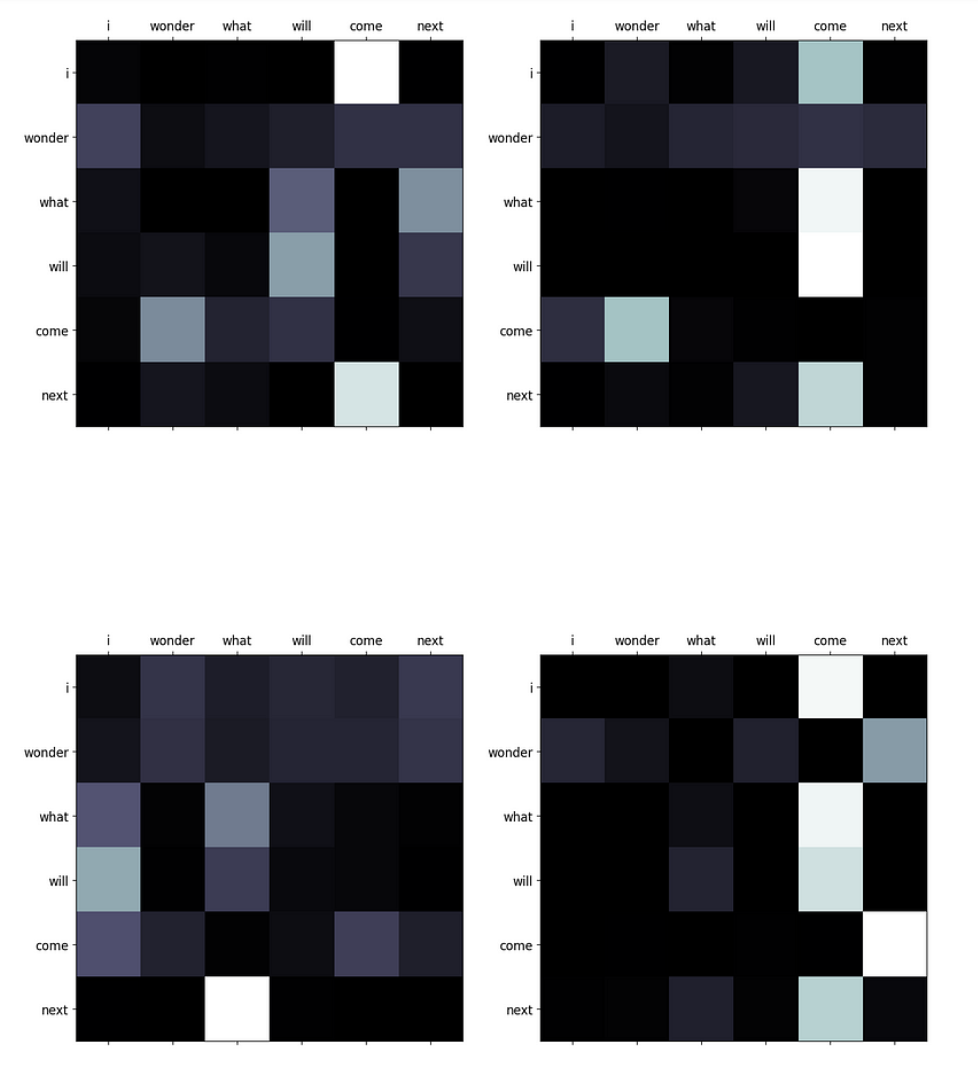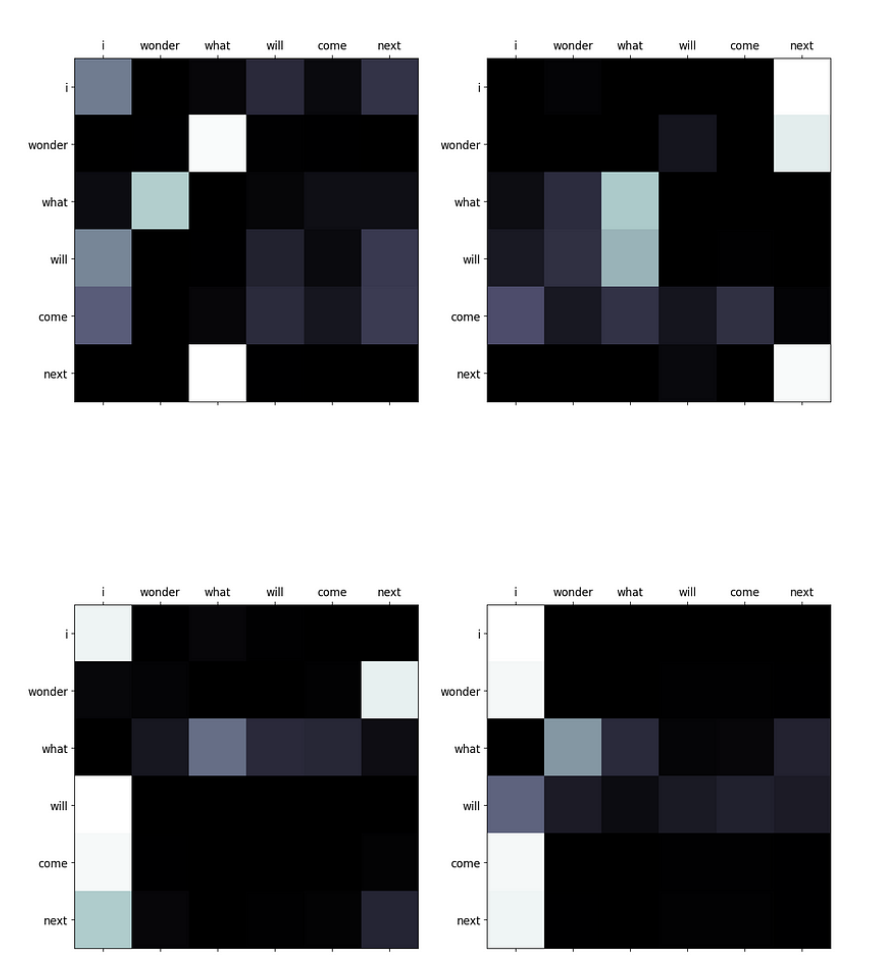 display_attention(["i", "wonder", "what", "will", "come", "next"],[],attn_probs[0], 4, 2, 2)