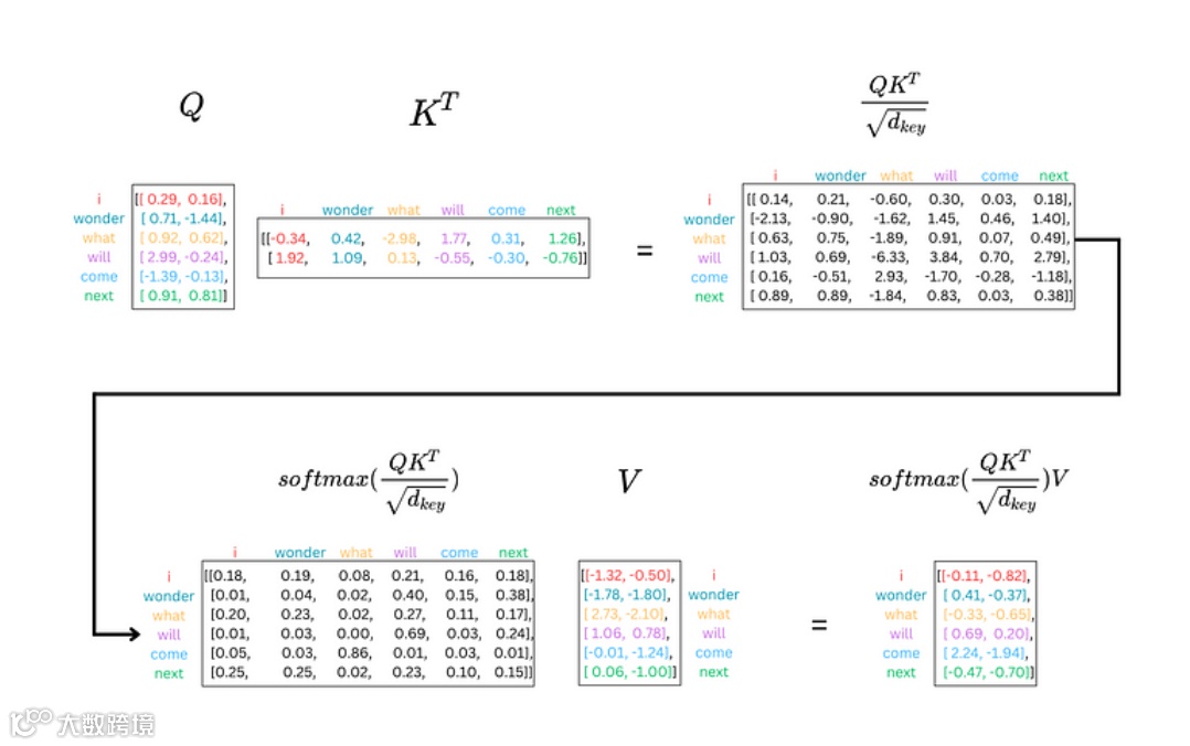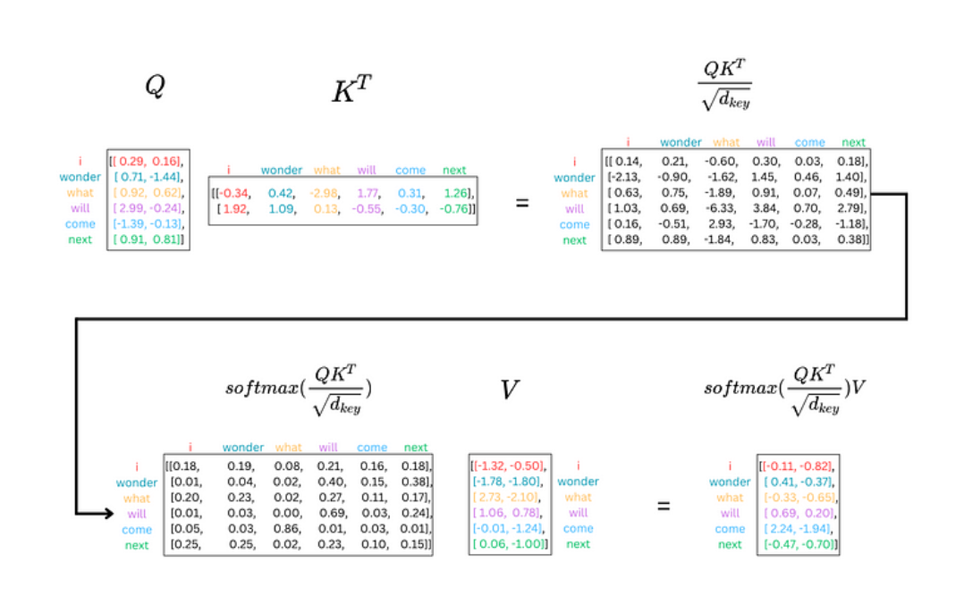 softmax 张量中的每一行表示一个标记Token与同一序列中其他标记Token之间的关系。在 V 中,每一列都代表一个序列。将这两个张量相乘,可对Values进行重新加权,并计算出每个头部或子空间中每个标记Token的最重要的上下文信息。