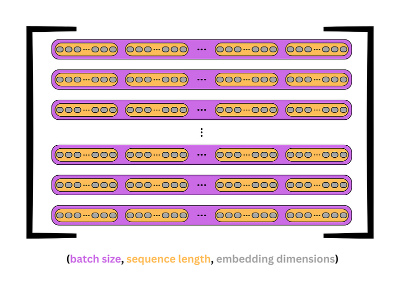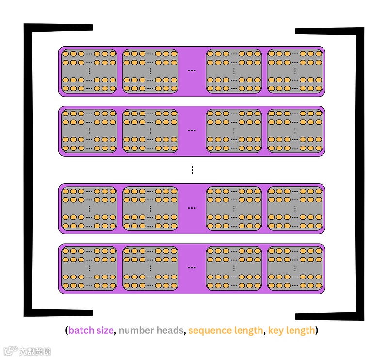 该张量的可视化效果如下图所示。每个序列为紫色,每个head为灰色。在head中,每个标记都是一排 d_key 个元素。