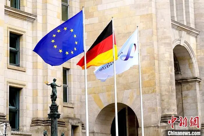 资料图:当地时间2020年7月1日,德国柏林,德国国会大厦前从左到右依次挂出代表欧盟、德国和德国担任欧盟轮值主席国的三面旗帜。中新社记者 彭大伟 摄