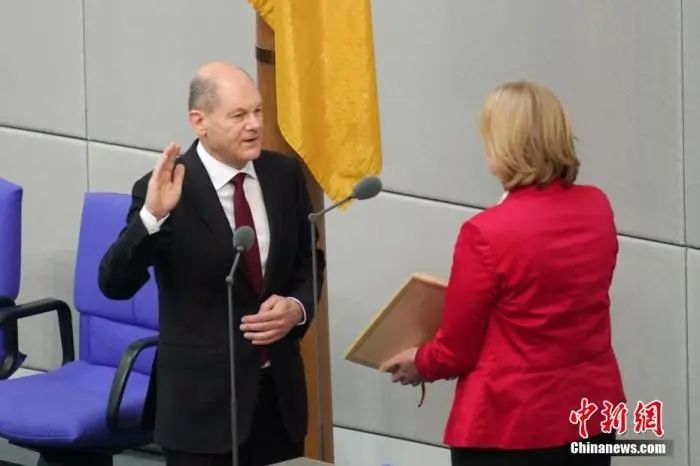 资料图:当地时间2021年12月8日,德国新任总理朔尔茨及新政府内阁全体成员在柏林的德国联邦议院宣誓就职。中新社记者 彭大伟 摄