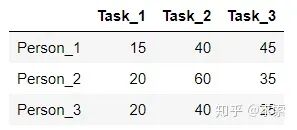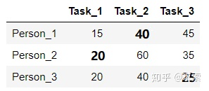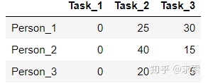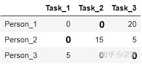 举个例子,假设现在有3个任务,要分别分配给3个人,每个人完成各个任务所需代价矩阵(cost matrix)如下所示(这个代价可以是金钱、时间等等):