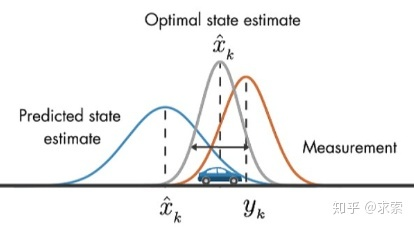假设我们要跟踪小车的位置变化,如下图所示,蓝色的分布是卡尔曼滤波预测值,棕色的分布是传感器的测量值,灰色的分布就是预测值基于测量值更新后的最优估计。