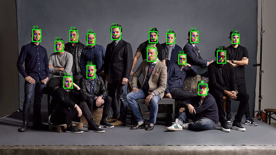 可以看到它准确的识别出了图片中所有的人像,在 CPU 上仅耗时 133ms 且置信度都为 99%。下图为加上 bounding box 后的检测效果图:
