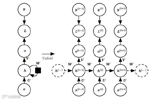 循环神经网络 ( RNN ):如果训练样本输入是连续序列,则 DNN 和 CNN 不好解决。RNN 假设样本是基于序列的,对应的输入是样本序列中的 x(t),而模型在序列索引号 t 位置的隐藏状态 h(t) 由 x(t) 和 h(t-1) 共同决定。在任意序列索引号t有对应的模型预测输出 o(t) 。也就是说,RNN 是包含循环的网络,允许信息的持久化。