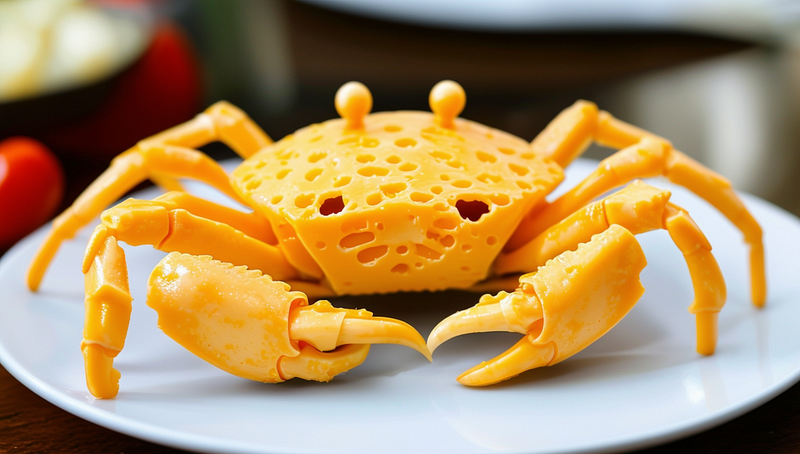 Prompt: A crab made of cheese on a plate