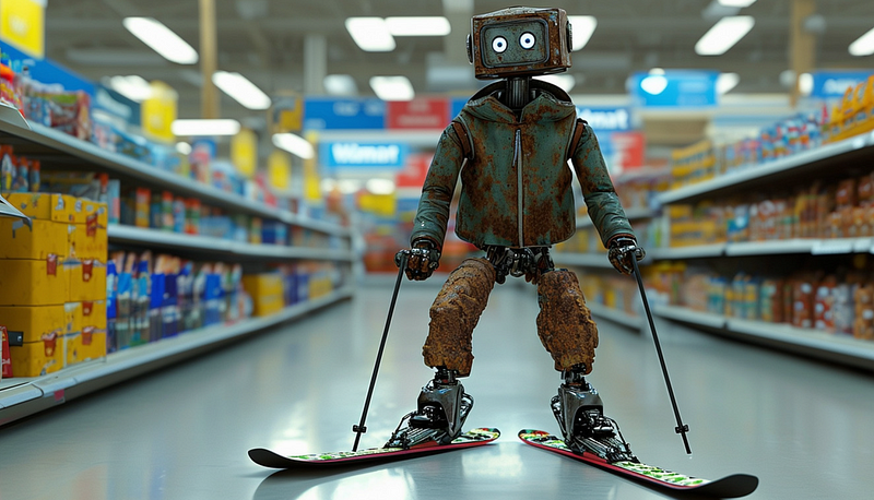提示:一个锈迹斑斑的老机器人穿着裤子和夹克,在超市里滑雪。