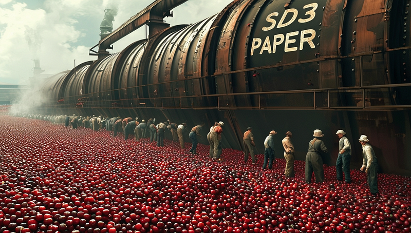 提示:一千名工人采摘樱桃,然后把樱桃送进一台用蒸汽运转的机器,这台机器有摩天大楼那么大。机器侧面写着:"SD3 Paper"